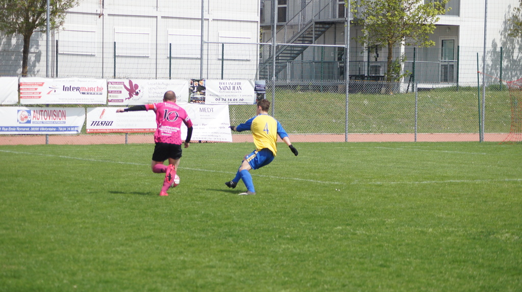 La suite de la première mi-temps est un peu plus brouillon que la première partie. Tout d'abord, Cheyssieu obtient un coup-franc bien placé qui finit dans le mur. Suite à ça, l'équipe domicile attaque et tente trois tirs assez dangereux, mais heureusement, non cadrés. Sur une quatrième attaque d'affilé, Jonathan sort sur l'attaquant pour dégager le ballon. Les joueurs roses décident alors d'acculer les visiteurs ce qui pousse les milieux à revenir défendre. Miguel, en duo avec Thomas, arrive à stopper un attaquant qui voulait passer sur le flanc gauche de Cheyssieu. Derrière, les St Georgeois poussent encore et encore et obtiennent un corner, qui ne donnera rien, puis arrivent à tirer sur la barre transversale et en lucarne. Mais Jonathan effectue un bel arrêt.